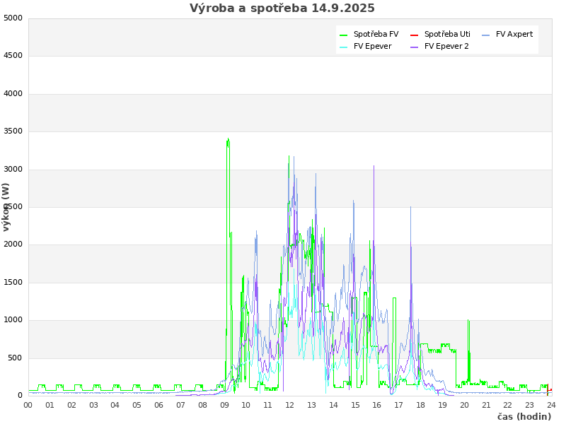 | Den | FV výroba (kWh) | Spotřeba (kWh) | Odběr ze sítě (kWh) | Soběstačnost (%) |