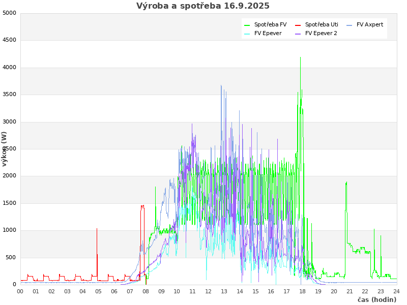| Den | FV výroba (kWh) | Spotřeba (kWh) | Odběr ze sítě (kWh) | Soběstačnost (%) |