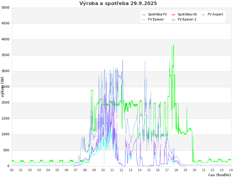 | Den | FV výroba (kWh) | Spotřeba (kWh) | Odběr ze sítě (kWh) | Soběstačnost (%) |