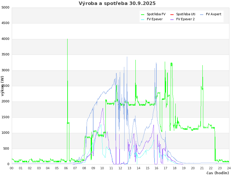 | Den | FV výroba (kWh) | Spotřeba (kWh) | Odběr ze sítě (kWh) | Soběstačnost (%) |