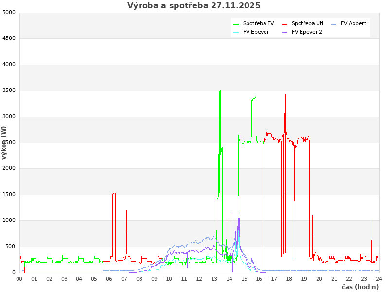Studer (zasuvky): 1342 W, rele: 0 (0=baterie; 1=Uti)