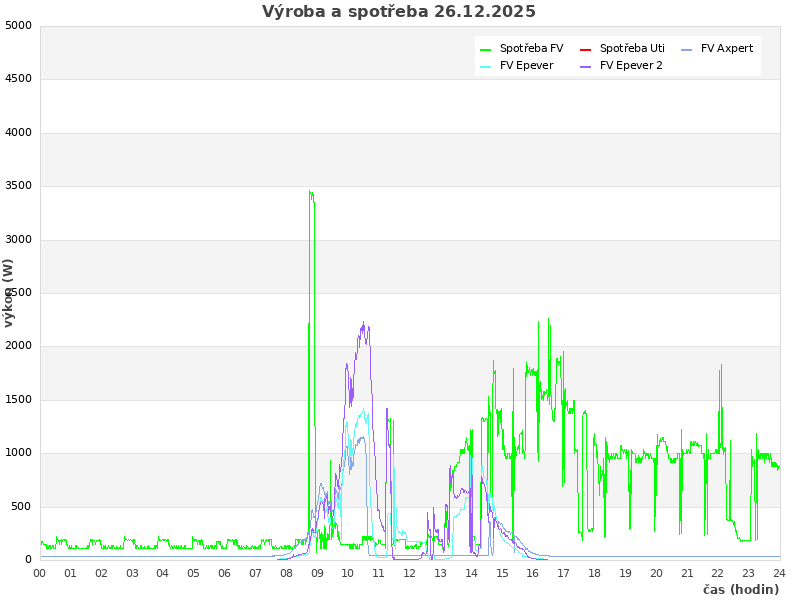 | Den | FV výroba (kWh) | Spotřeba (kWh) | Odběr ze sítě (kWh) | Soběstačnost (%) |