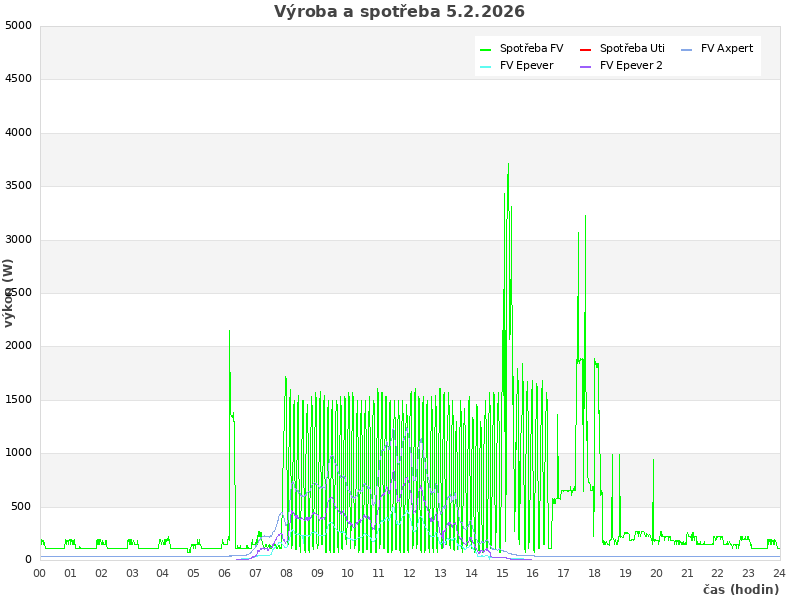 | Den | FV výroba (kWh) | Spotřeba (kWh) | Odběr ze sítě (kWh) | Soběstačnost (%) |