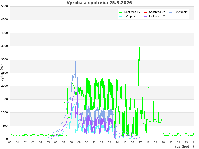 Studer (zasuvky): 1075 W, rele: 0 (0=baterie; 1=Uti)